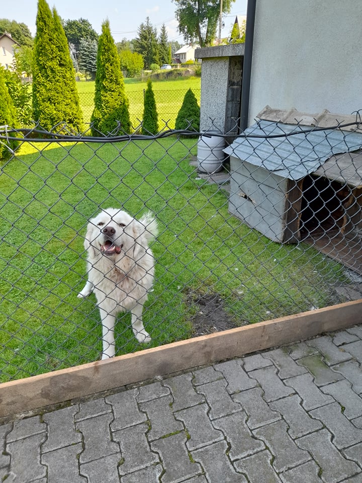 Byłyśmy pod tym adresem w sobotę. Młoda sunia w typie owczarka podhalańskiego w niewielkim kojcu dobudowanym do blaszanego silosa na zboże. W dodatku od południowej strony... Taki silos przy upalnej pogodzie działa jak rozgrzany do czerwoności piec.