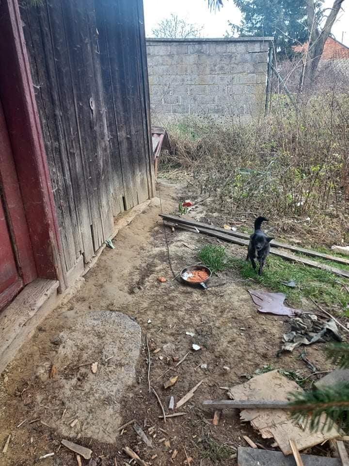 Nie łudźcie się - w misce jest nasza karma, którą inspektorki podały natychmiast, tak samo jak wodę. Nie było mowy, żeby zostawić sunięw tym miejscu. Chociaż na co dzień pomagamy zwierzętom, a złe warunki ich utrzymywania powodują u nas wewnętrzny potok przekleństw i ogromne zdenerwowanie na właścicieli, to i tak dziewczyny podarowały kobiecie swoje drugie śniadanie. Kobieta jest bardzo nieporadna życiowo (nie ma nawet bieżącej wody). Podejrzewamy nadużywanie alkoholu. Zrzekła się praw do Poli.