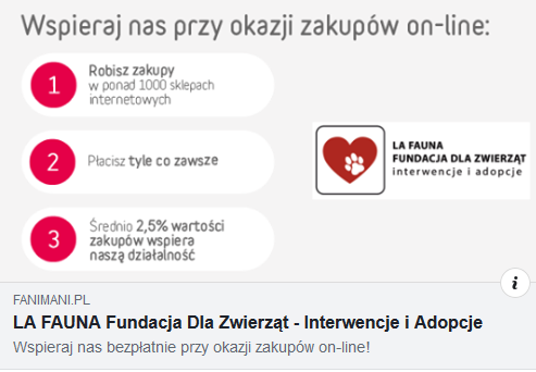 Wiedzieliscie,że możecie nas wspierać robiąc zakupy dla siebie, swoich bliskich, remontując dom czy nawet zamawiając jedzenie online ? Teraz jest taka możliwosć, a wy nie ponosicie przy tym żadnych dodatkowych kosztów ! Zamawiasz jak zawsze, płacisz tyle co zawsze, a około 2% od kwoty waszych zakupów wpływa na rzecz naszej fundacji 😃