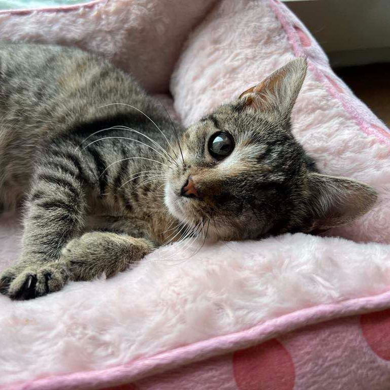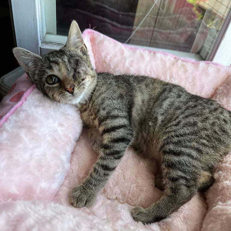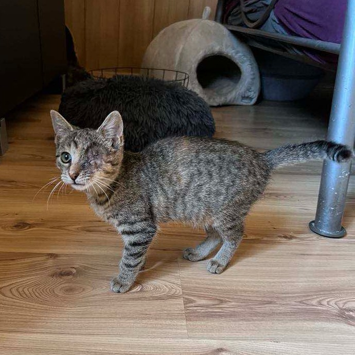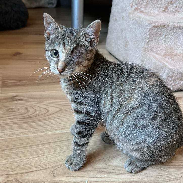 To ok 3,5 miesięczna kicia odłowiona ze stada bezdomnych kotów. Trafiła do nas z bardzo poważnym urazem oka, które musiało zostać usunięte.