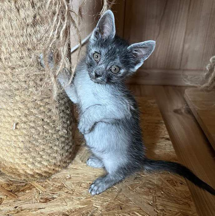 Nitka to około 7 tygodniowa kotka znaleziona jako ledwo chodzący maluszek w krzakach bez mamy i rodzeństwa.
