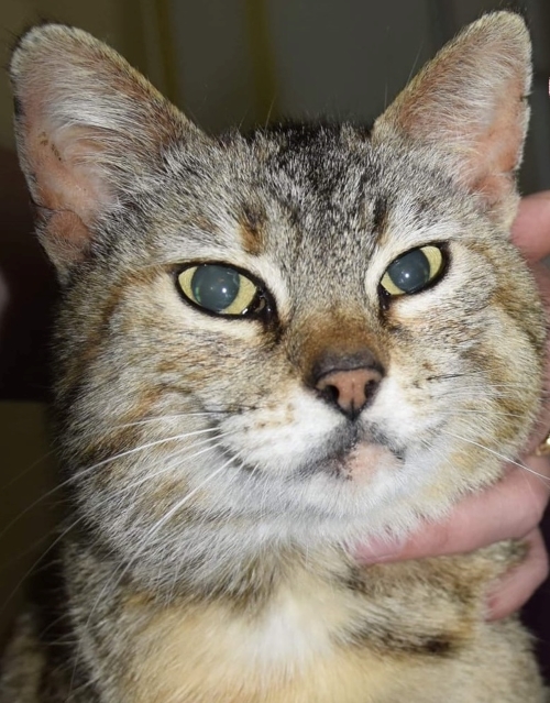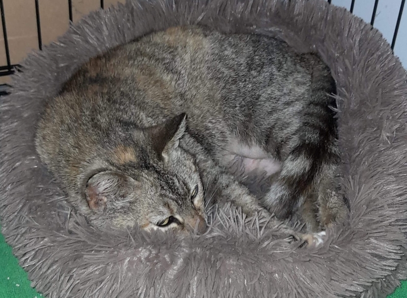 Znaleziona na posesji podczas interwencji. Miała guzy na listwie mlecznej. Człowiek ich nie wyczuł, bo człowiek miał kota do zwalczania myszy, a nie głaskania...Odebraliśmy Wikusię na zrzeczenie.