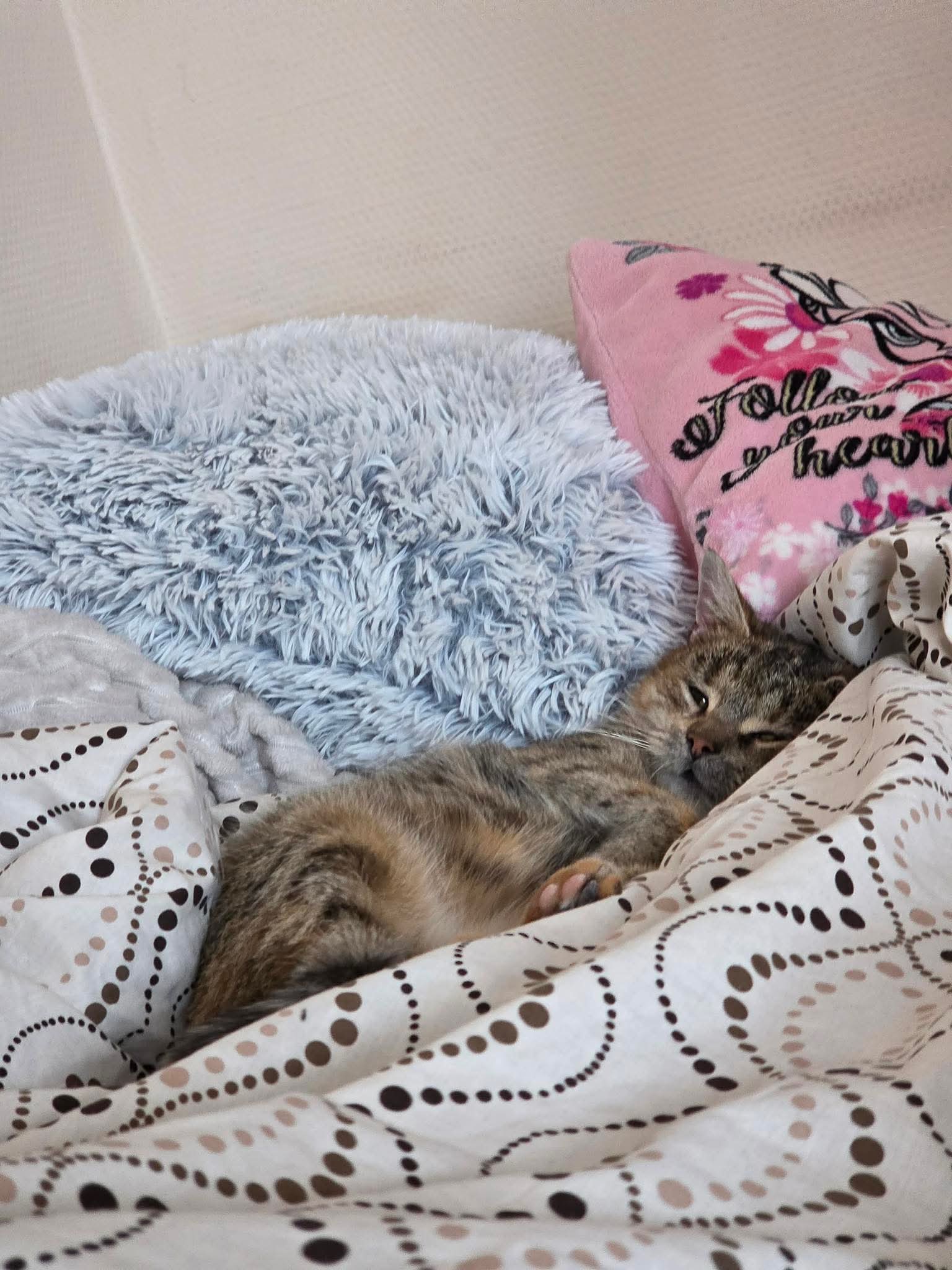 To oko艂o 2-3 letnia kotka, zakochana na zab贸j w cz艂owieku. Uwielbia mizianie, wsp贸lne sp臋dzanie czasu i towarzyszenie we wszystkich, codziennych czynno艣ciach.
